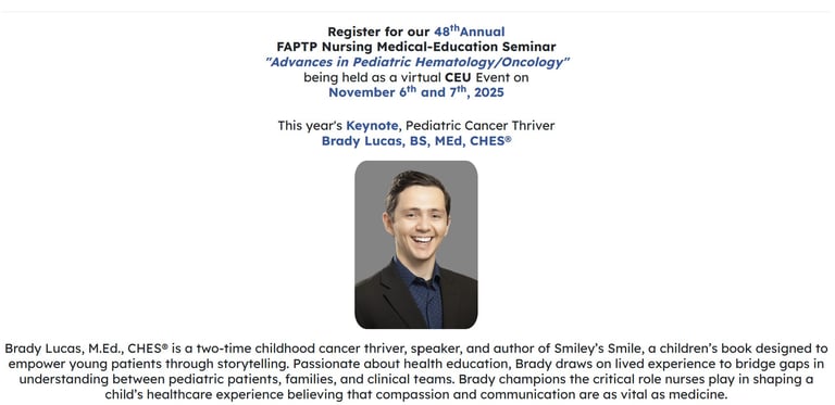 In 2025, the Florida Association of Pediatric Tumor Programs (FAPTP), contracted with Brady C. Lucas, M.Ed., author of Smiley’s Smile, to present the Keynote speech for our 48th annual medical education conference, “Advances in Pediatric Hematology/Oncology” held in November. Brady, a two-time cancer survivor, provided the attendees with a heartfelt and insightful presentation taking everyone on his journey through the many up’s and downs of his cancer battle; leaving the national audience of pediatric hematology and oncology nurses grateful and inspired by the kind words he used to describe the many healthcare professionals who shared in his struggle and ultimate victory over cancer. FAPTP’s 48th annual seminar was greatly enhanced by Brady’s courageous story. -Brian Calkins FAPTP Program Director